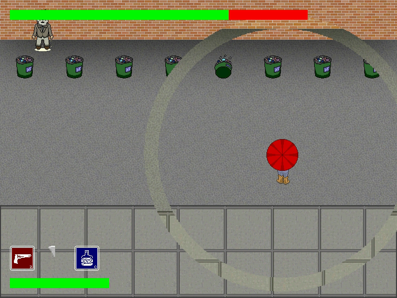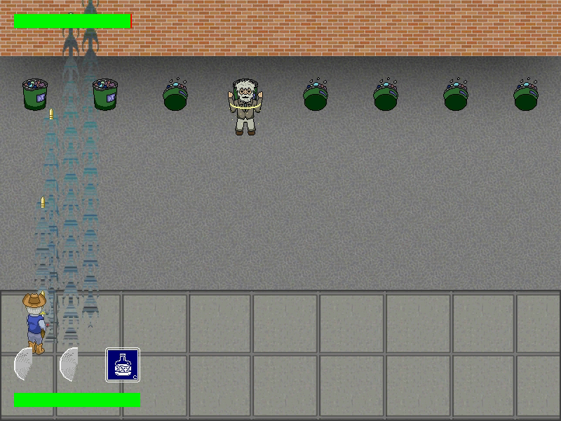 The code for the entire boss sequence was completed from start to finish in a single night (as I was still waiting on art assets...), and the difficulties were added after that. He has six behaviors: jump, block, throw trash, throw trash fast, heal trashcans, and throw stray dogs. Based on the time frame, I'm really proud of the finished product.