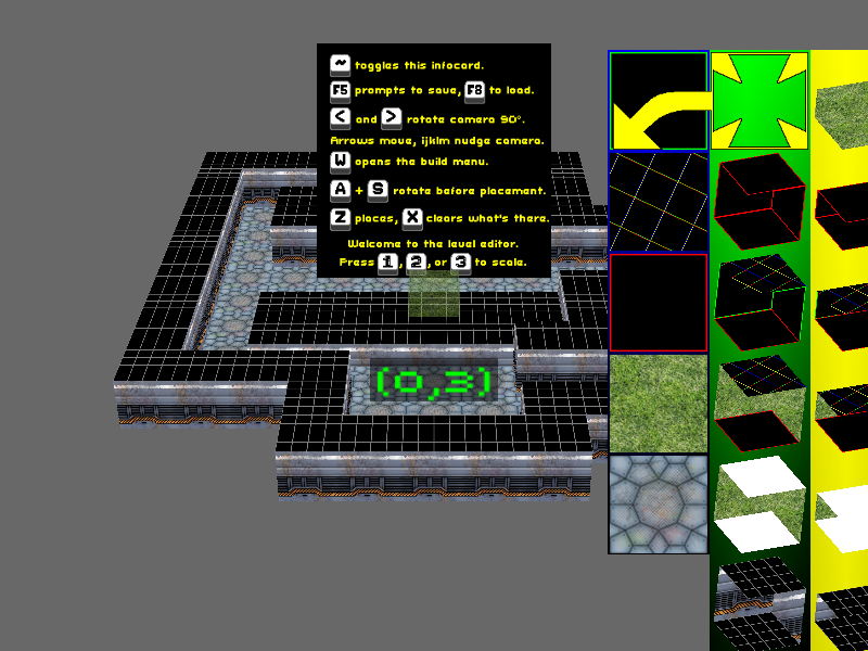 Another feature was a runtime level editor, which provided an advanced set of level creation tools, and could load new textures specified by text files. Combined with a ten-line code file specifying active object positions, players could add new levels to the game (with their own art assets!) quickly and easily.