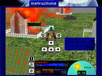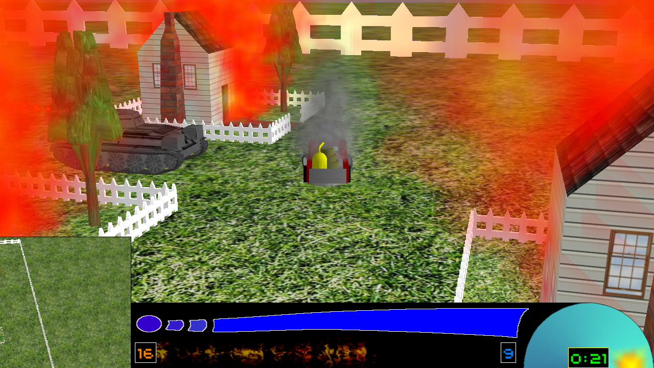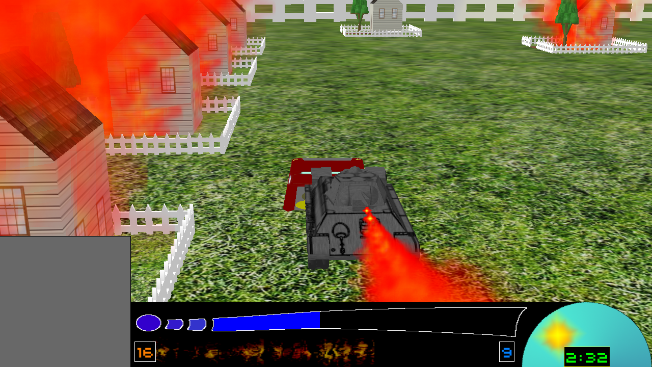 Another was the radar screen, which was a second camera placed over the player. It showed a better view of the game world, and featured three zoom modes. When you were crushed or burned by a tank, you would stall and the radar would jam, flickering and spinning around randomly for a short period of time.