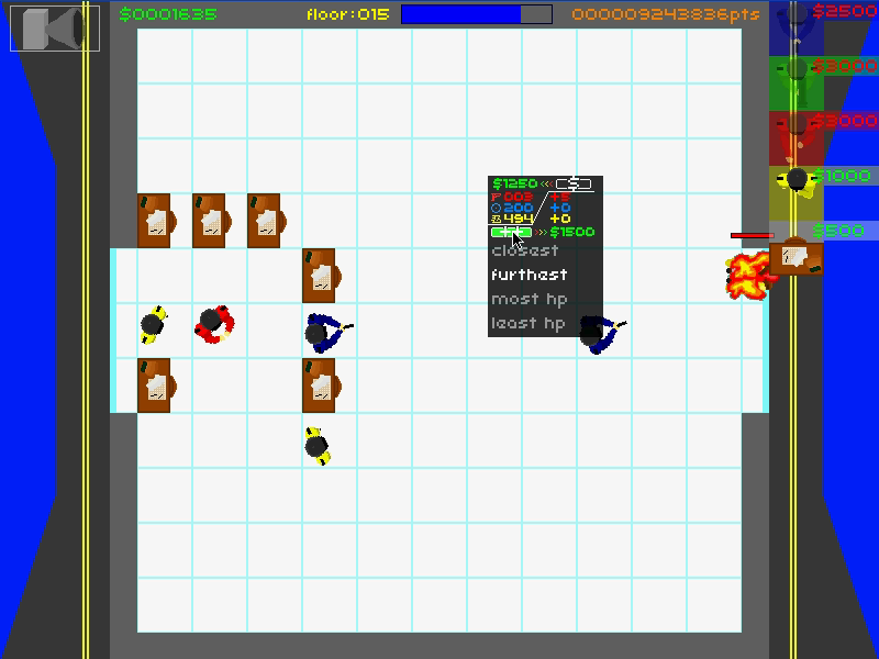 All units but the desks rotate smoothly to face their targets, to indicate which enemy they are targeting. This was done by using the firing delay as the percentage to move between the current rotation and the targeted rotation. Upgraded desks have a secret overpowered attack, where an employee throws a paper plane on a curved animation arc toward the targeted enemy, and this plane also faces its target smoothly.