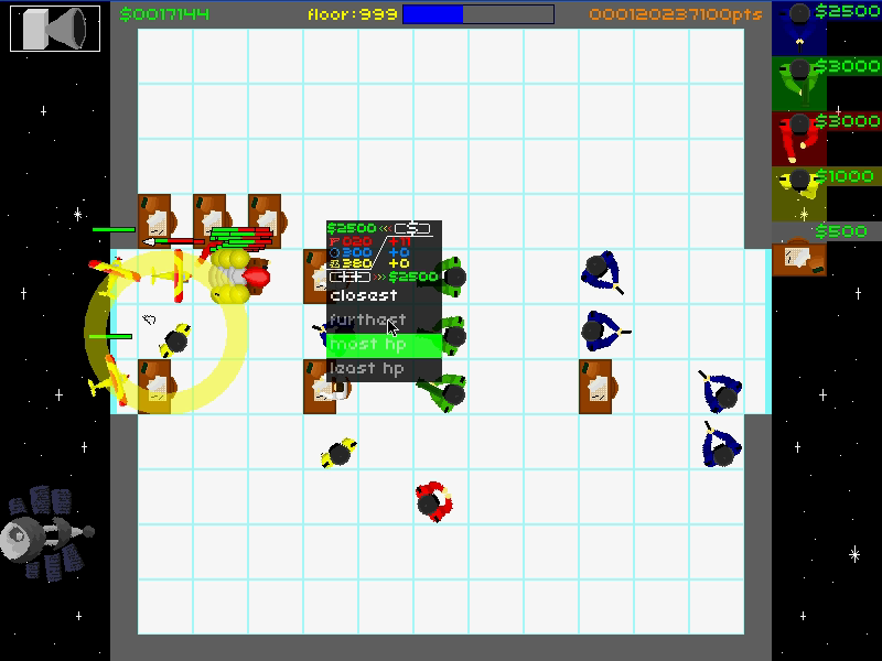 Lastly, the fighter was initially supposed to punch once, and then return to its position (by animating half the distance between the target and back). However, in balancing Erik Finnegan discovered that if you dropped the attack delay below the animation time, the fighter would freak out and taze its enemies to death. This was found to be so humorous that the final balancing was decided to have this "feature".