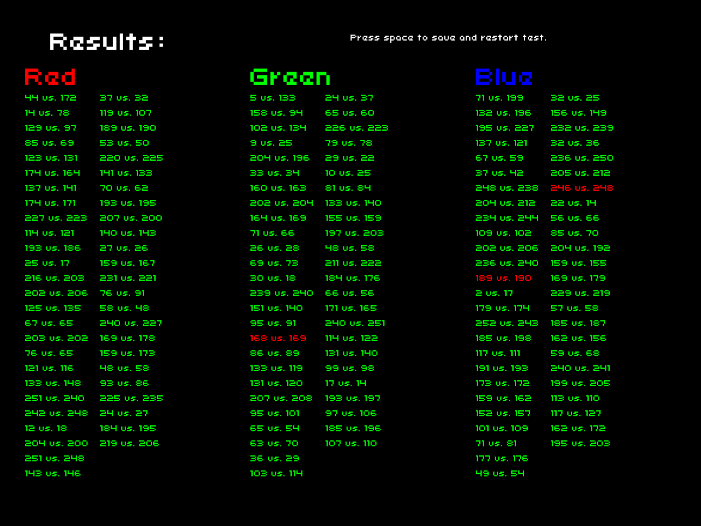 A project for a psychology class at RPI - Sensation & Perception. This assignment concerned just noticeable difference thresholds (JND thresholds), so I designed an experiment testing color perception. Basically, the program randomly generated two colors with a certain intensity difference, across the entire range of intensities. It also fine-tuned the testing differences based on how a subject performed, in order to get more accurate data around their threshold.