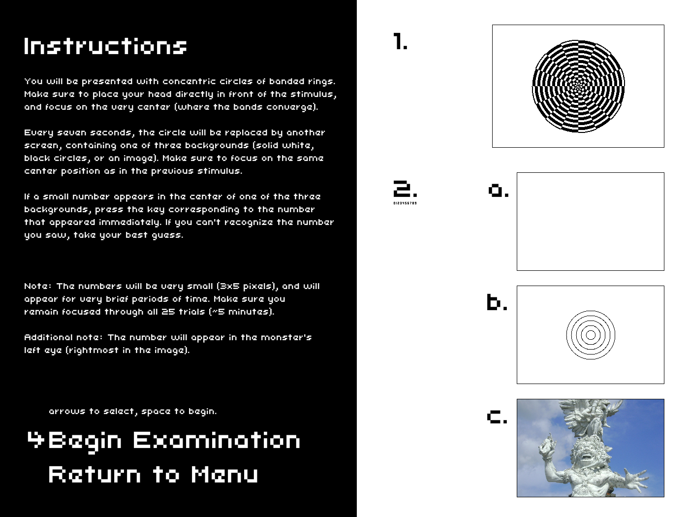 The experiment presented a high-contrast circle of alternately banded rings, which moved towards the center at a constant speed. Then it presented one of three background stimuli (which represented high context, low context, and zero context), and flashed a very small number (3x5 pixels) for a brief period. Subjects were instructed to press the number key that corresponded to the number seen.