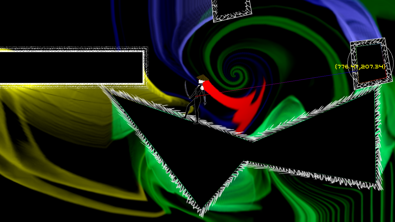 Basically, each object draws its own distortion and colors into the respective buffers, and then the color buffer is warped with pixel accuracy, using the distortion buffer as the coded amount. All the in-game objects in the video draw a 1px outline of an arbitrary color around their collision geometry, and have a swirling distortion effect. In the background of the distortion buffer, the overall direction of the player's movement was used as the distortion, to keep Reana's hair in roughly the right place over time.